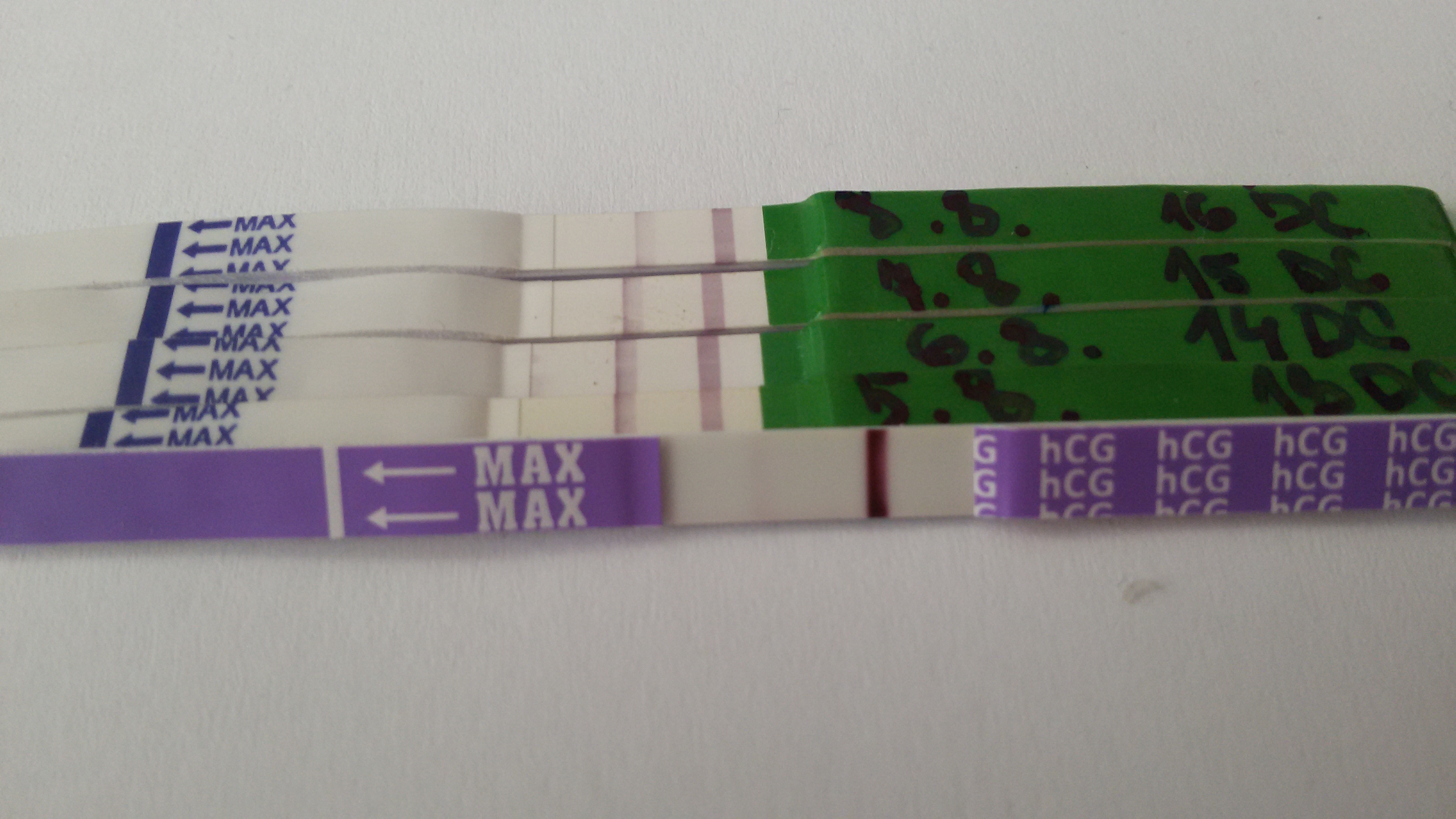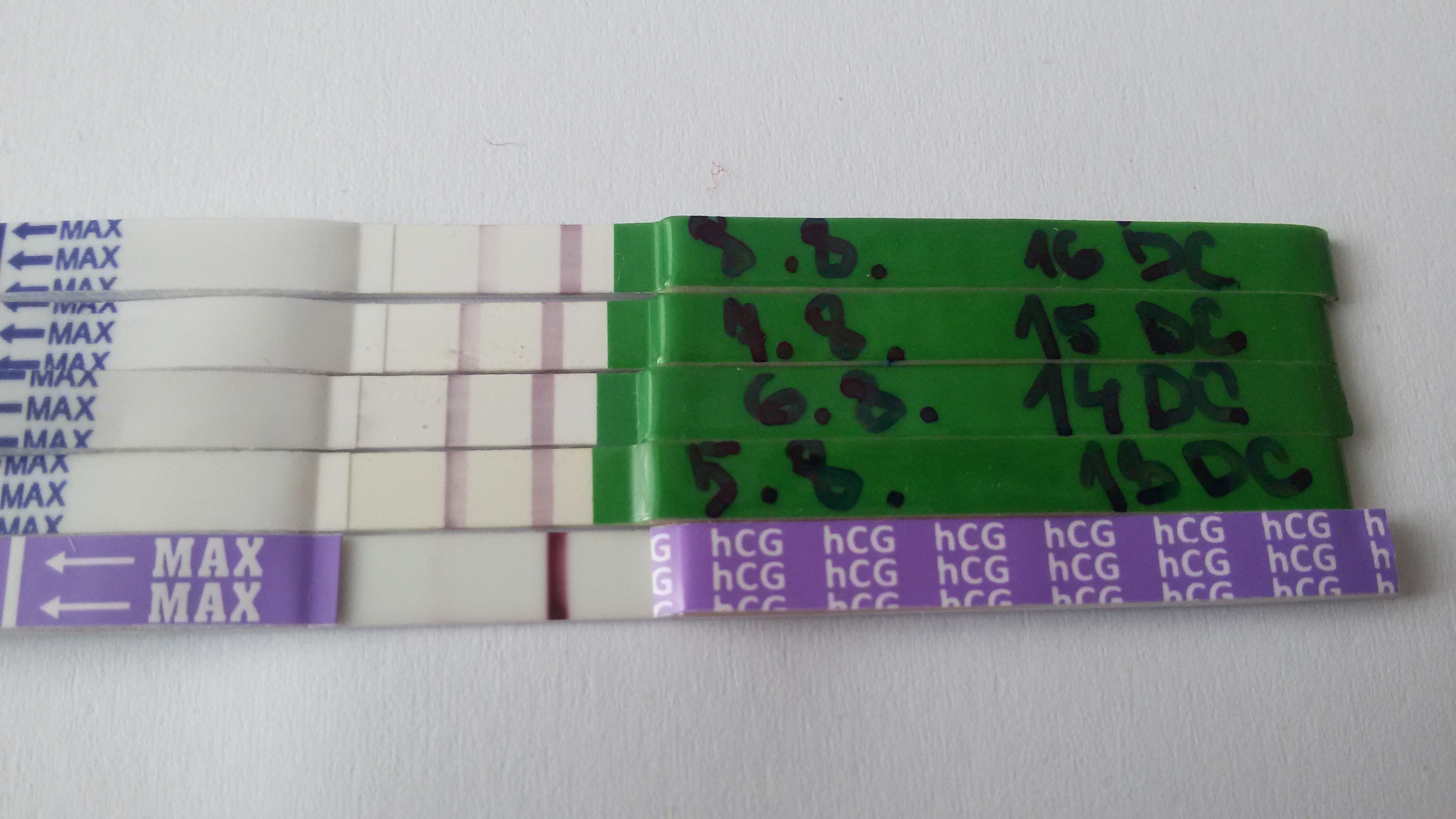 4.8. jsem byla na měření foliku a byly tam tři ( 2 levá 1 pravá ) 17 mm , 5.8 jsem byla dopoledne na pichnutí pregnylu a 6.8 na IUI , dneska jsem 19 DC a od IUI 6 dní, cykly mám 28 -30 dní , dělala jsem si i ovu testy od 5.8 - 8.8 viz foto, 9.8 už byl ovu test negativní, dělala jsem si tt test též 9.8 a byl sněhově bílý .... dneska jsem našla ještě jeden a tak jsem si ho ze srandy udělala a byl tam duch, na fotce nejde nák extra vidět ale když ho vemu do ruky jde vidět ... jen bych chtěla říct že skoro po roce snažení, 3 IUI tam je ten duch poprvé až dneska .... no kéž b to vyšlo a hlavně aby bylo vše v pořádku, brala jsem clostík a ted od 17 DC beru duphaston 1-1-1 Děkuji za odpovědi