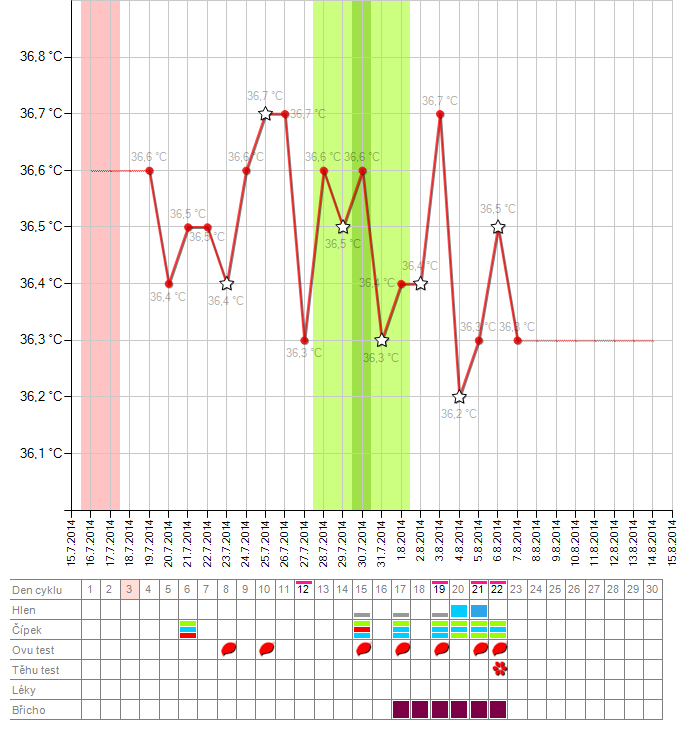 Ahoj, chtěla bych se zeptat, zda v tomto grafu vidíte ovulaci? Já zatím ne. Jedná se o anovulační cyklus? V květnu jsem prodělala revizi. Mám za sebou dva cykly po 30 a 31 dnech. Dnes jsem už 23 DC a ovu zřejmě nikde.