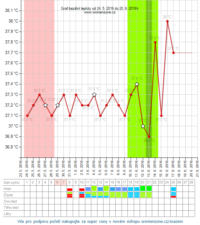 17.6.2016 13:40teplota před a po ovulce skákat může, ale podle tvého grafu bych spíše usoudila, že jsi nemocná. teplota 38 není normální ani v BT. sice se při měření BT měří v ústech nebo v pochvě, takže se od naměřené teploty odečítá cca 0,3-0,5°C, ale pořád z toho vyleze zvýšená teplota minimálně tři dny a z toho se ovulace určit opravdu nedá