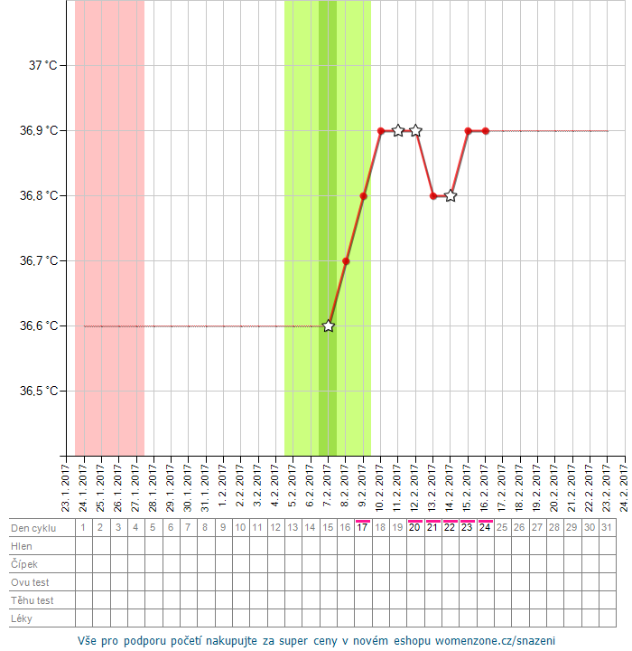16.2.2017 16:30Tak já bych řekla, že tu ovu jsi pravděpodobně "chytla" (tak 15dc) a je tam vidět nárůst teploty. Plochý graf není neobvyklý, ale na další soudy je brzy.