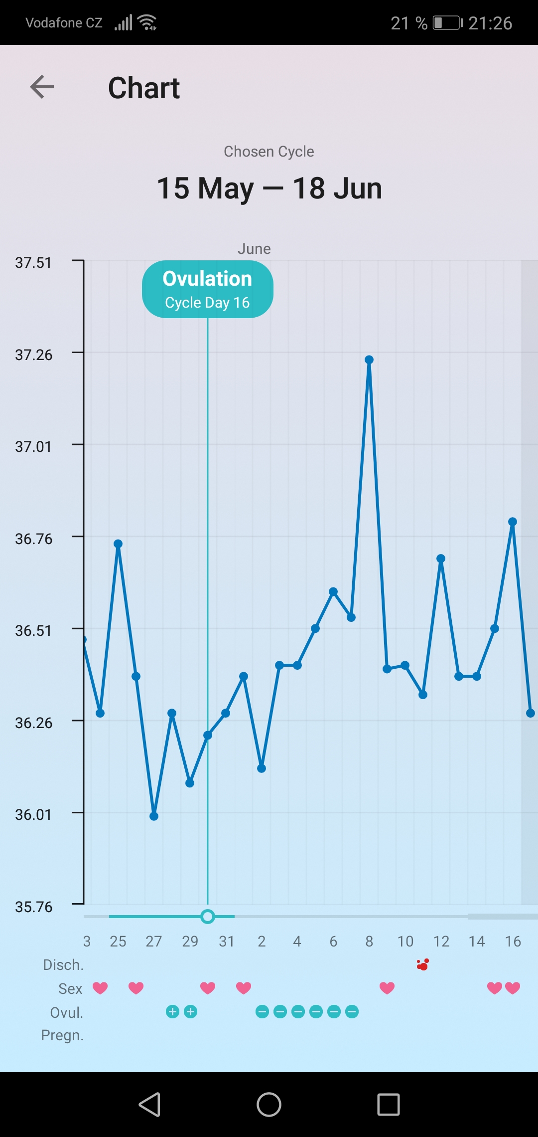 18.6.2019 7:55Ahoj, dle grafu bych řekla, že se ms brzy objeví. Pokud měříš ve stejnou dobu a nejlépe v pochvě, pokles je velký. Kdyby jsi byla těhotná, teploty se drží stále vysoko.