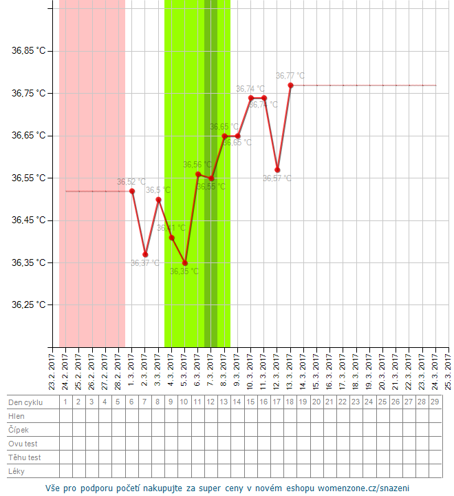 13.3.2017 14:01Standardní graf po ovulaci.jednodenní pokles není nic závažného.někdy to značí implantaci vajíčka,není to ovšem pravidlo.za nějaký týden už budes moudřejší a uvidíš,jestli se povedlo čí ne,pokud tedy usilujes o mimi