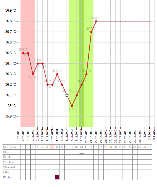 Ahoj holky,vím,že ten graf není až do konce ale i tak se chci zeptat tech zkušenejších...myslíže,že ovulka byla 17.12?Moc se v tom nevyznám jen je mi divné,že teplota stále stoupá =)