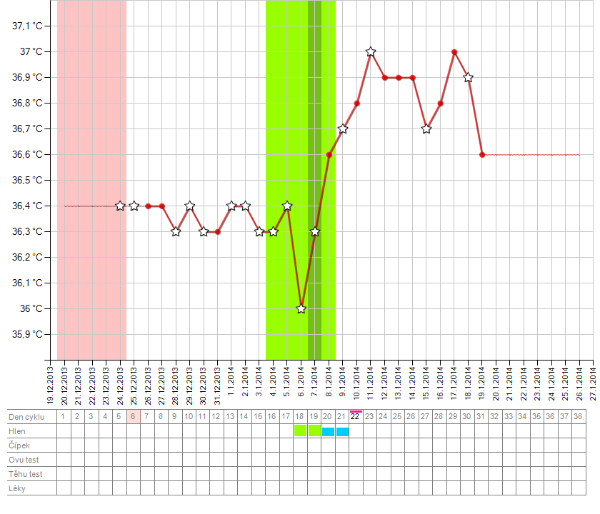 Holky snažilky, které jsou stejne nedockavky jako já, můžete mi kouknout na graf co znamená ten pokles dneska? Nerozumím tomu dnešnímu poklesu, ms to být nemůže, mam ji mit az 27 a teplota mi vždy klesá 2 dny před ms.. mam dlouhý cyklus a dnes jsem 12DPO, myslíte ze mam jeste šanci na mimco? Moc diky