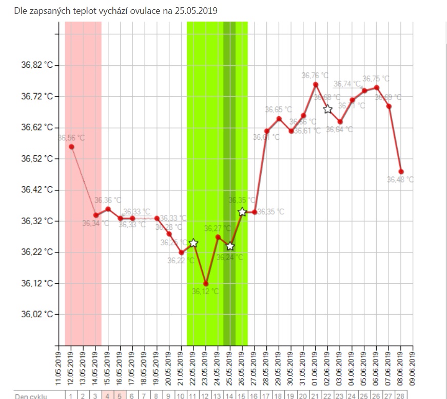 • Obávám se, že ovulace ještě nebyla, z grafu to vůbec není patrné. A to že máš BT někdy 37°C ještě vůbec neznamená, že jsi těhotná. Teplota se musí držet minimálně 18 dní výš, ale nemusí být vždy 37°C, někdo má takovou teplotu po ovulaci úplně běžně. Občas mívám i já a stejně z toho nic zatím nikdy nebylo. Přikládám jeden z mých grafů, měřím už dlouho, takže se v tom už orientuju a řekla bych, že mé grafy jsou celkem "ukázkové". Ovulaci mám i potvrzenou ultrazvukem, takže probíhá, oba s partnerem jsme v pořádku a pořád nic. Přeji hodně štěstí, ať se brzo zadaří :)