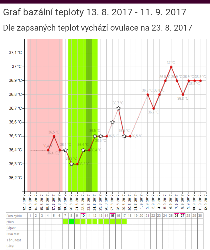 11.9.2017 19:22Zatím to vypadá jako běžný graf, protože ovu tam vidím spíše k 31.8. (100% by to řekla ona chybějící teplota následující den 1.9. a 2.9. a ty by pak přepsaly i tu nyní vyznačenou ovu k 23.8.). Kdyby ovu byla 23.8., tak už nyní máš dávno pozitiví TT, protože tam je nějakých 18 dnů po domnělé ovulaci k 23.8.. Takže nezbývá než vyčkat 1-2 dny a znovu testovat. Ale pokud špiníš, může to být taktéž počínající MS. Já to takto vždy měla, při otěhotnění jsem najednou nešpinila. Orgasmus nidaci určitě neohrozí, stejně tak prosperující těhotenství.