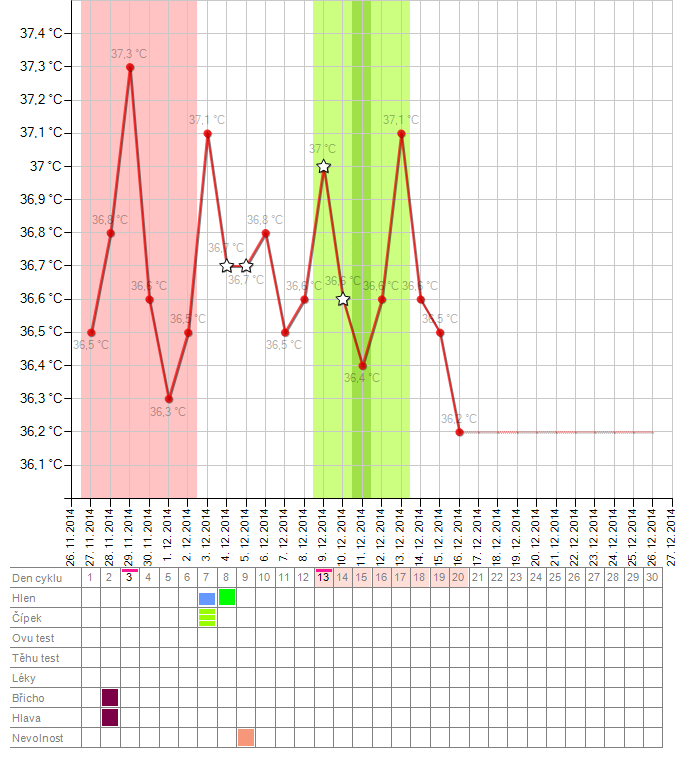 18.12.2014 6:49Nepotesim te ale mas naprosto ukazkovy anovulacni graf - netrpis na pco? Spineni a zaroven i anovulak zpusobuji casto prave cysty. Bohuzel to znam
