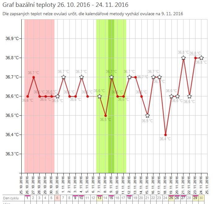 Ahoj, BT si měřím teprve první cyklus, chtěla jsem vědět, kdy mám ovulaci, ale z naměřených hodnot jsem toho moc nevyčetla. Dnes by měla přijít menstruace a přesto mám teplotu vyšší než obvykle, TT negativní, podbřišek poboliva asi tři dny, je možné, že mám ovulaci v dobe, kdy bych už měla menstruovat? Mate někdo podobný graf jako ja? O mimco se snažíme od února, v květnu konizace čípku pro CIN 3, v září biopsie v pořádku, takže od září se zase snažíme, je mi jasný, že mám trochu rozházené hormony, přesto jsem doufala, že z BT aspoň něco poznam.