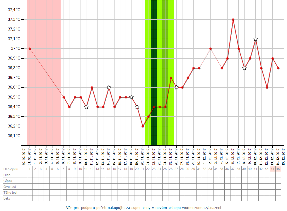 Ahoj holky, vím, že tyto dotazy tu jsou denně, ale co si myslíte o mém grafu? Normálně mám menstruaci celkem pravidelnou. Dle bt mívám ovulaci vždy 19.-20. DC, luteální fáze je vždy 11 dnů, takže cykly mám 30-31 dnů. Tento cyklus se kolem 20. DC nic nedělo, takže jsem si myslela, že jde o anovulační cyklus. Jenže podle teplot mi to ukázalo ovulaci 25. DC. Ani v tu dobu nebyl sex, jen 5 dnů před a pak až dva dny po. Jsem už 45. DC a MS stále nikde. Sice jsem včera začala špinit, tak jsem si myslela, že už je tu, ale nic. Měla jsem jen ráno hnědé špinění na toaletním papíře, po zbytek dne nic. Dnes ráno zase trochu špinění, možná o trošku víc než včera, ale zbytek dne nic. Už jsem 20. DPO, jenže mne zaráží tendence teplot klesat. Kdybych byla těhotná, tak se přece teplota drží nahoře. Jinak normálně mívám pokles teploty až v průběhu MS.