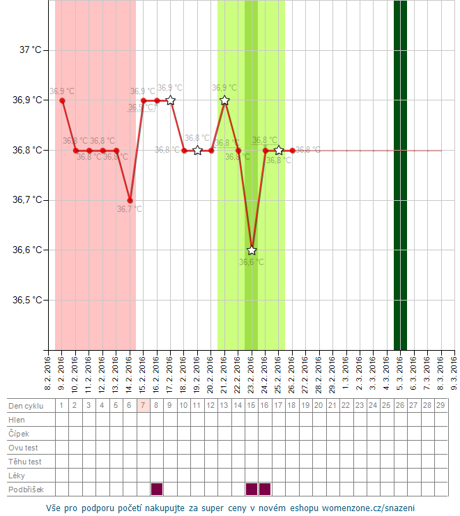 Ahojky,prosím podíváte se mi na graf?Jsem z toho zmatená.Vždy po ovu mi teploty vyskočí na 37,1-37,3 a nyní se mi drží již třetí den po poklesu na 36,8 což je dost málo,že?Takže asi ovulace nebyla.Ale podbřišek mě bolí.Tak nevím no...Budu ráda,když poradíte.