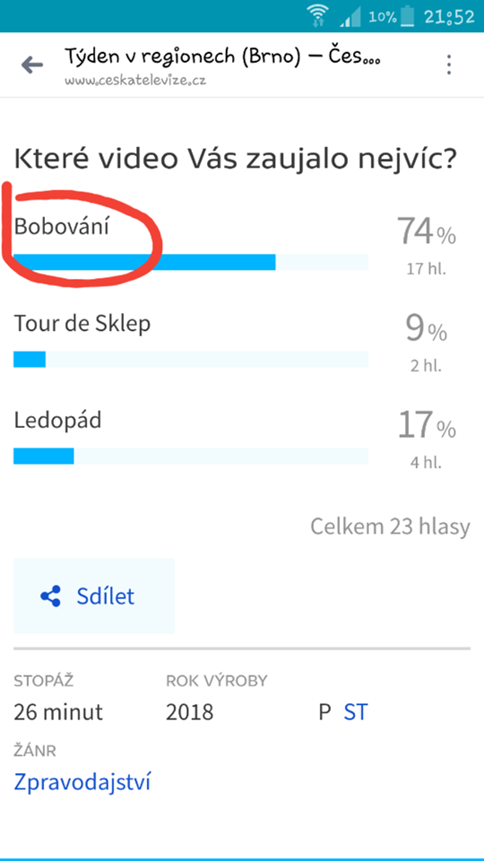 najde se tu někdo ochotný , kdo by mi dal hlas do soutěže,soutěžní video v české televizi, moje je bobování, v odkaze jsou 3 soutěžní videa pod videi je hlasování stačí kliknout na bobování a uvidíte jak hlas přibude. děkuji moc , hlasování končí dnešní půlnocí. Najde se tu aspon 15hlasů?????? kdo bude tak hodný?