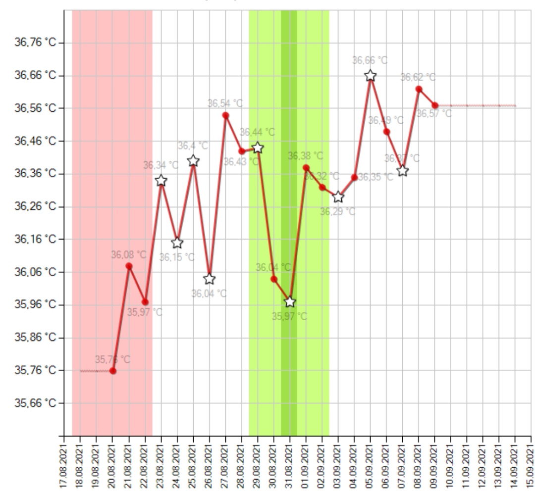 Ahoj, přikládám graf BT, netrpělivě čekám na příští týden na testování. Myslíte si, že je šance na těhotenství? Pravdou je, že některé dny měřím o cca 2 hodiny dříve kvůli práci, takže nejspíš záznamy nebudou tak přesné. Nicméně se mi dělá zle během dne od žaludku, někdy se mi zamotá hlava, bolí mě prsa a mám křeče v podbřišku. Dnes ráno mě bolelo břicho a záda,jak při silné menstruaci.