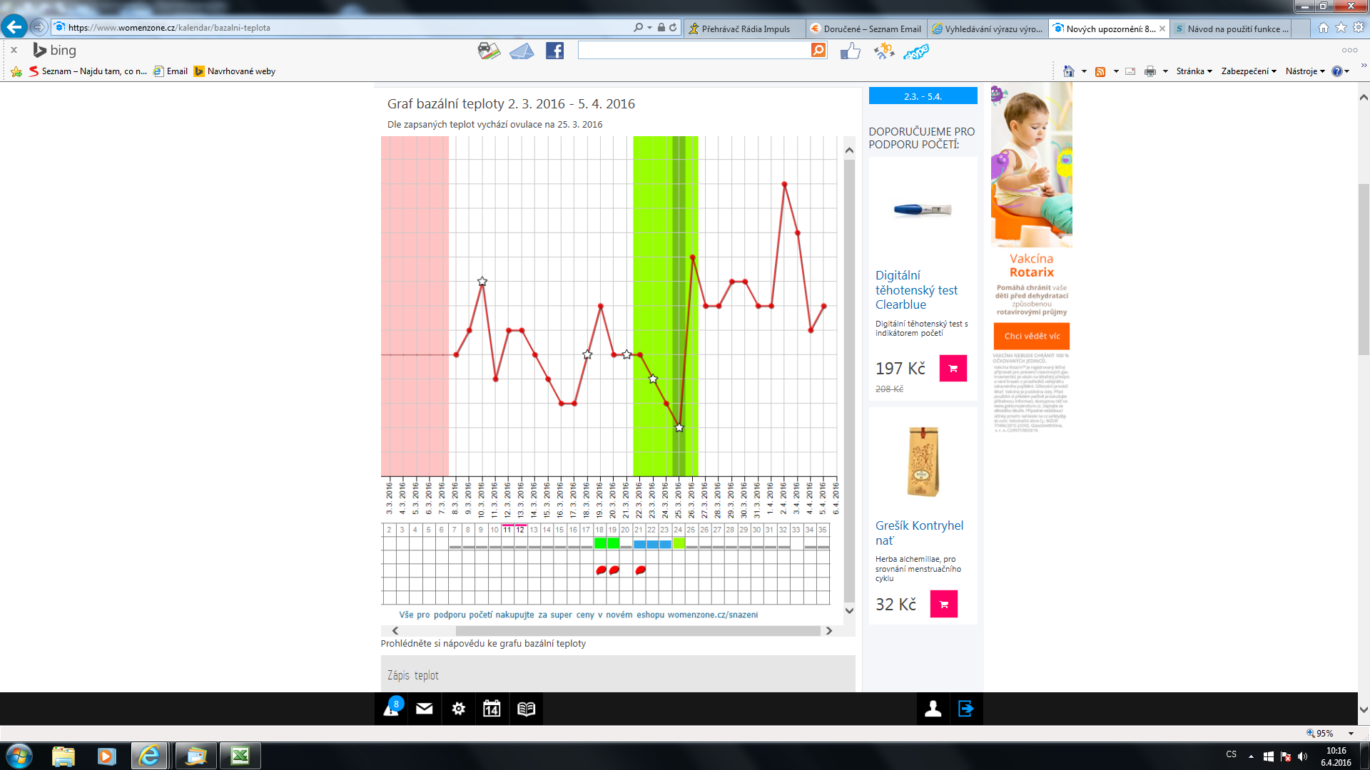 Moc prosím o radu....myslíte si, že muzu být těhotna? Graf přikládám....mám zpoždění 2 dny, což se mi ještě nestalo, pobolívá mne podbříšek i prsa...nechci si nic vsugerovávat....v srpnu 2015 jsem prodělala revizi v 8tt a od té doby se snažíme, první měsíc jsem měřila bazální teplota, pohlasvní styk byl v den ovulace i dva dny před ní....nevyznám se, ale v posledních naměřených teplotách...řekla bych, že by měly být v případě těhotenství spíše vyšší....na test si myslím, že je ještě brzy. Když byla ovulace teprve před 12 dny.
