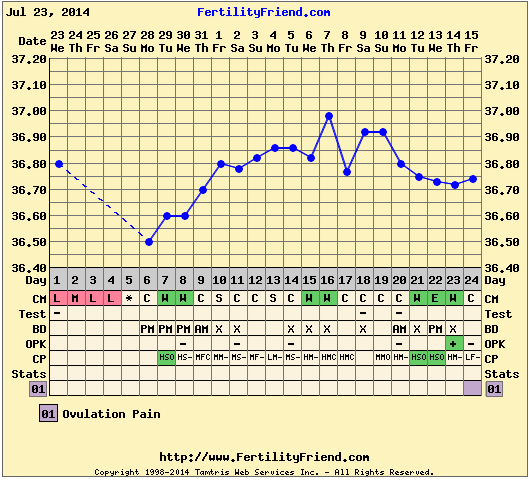 15.8.2014 23:25No podle hlenu a čípku bych ji určila na 22DC, ale teplota tomu nenasvědčuje, ačkoli je možné, že stoupne se zpožděním... S ovulačními testy zkušenost nemám ale tuším, že od nálezu pozitivního testu má ovu proběhnout do 2 dní. Uvidíš dál, pokud se teplota zvedne a bude držet nahoře. Podle grafu BT se ovu zatím určit nedá.