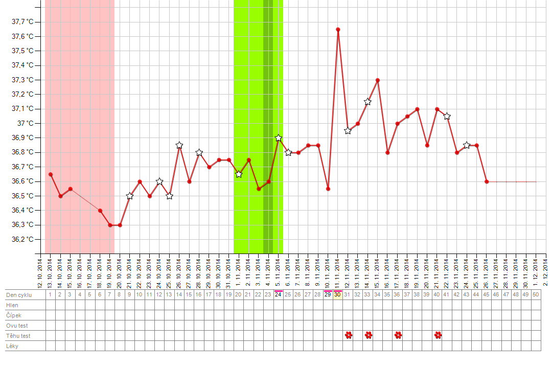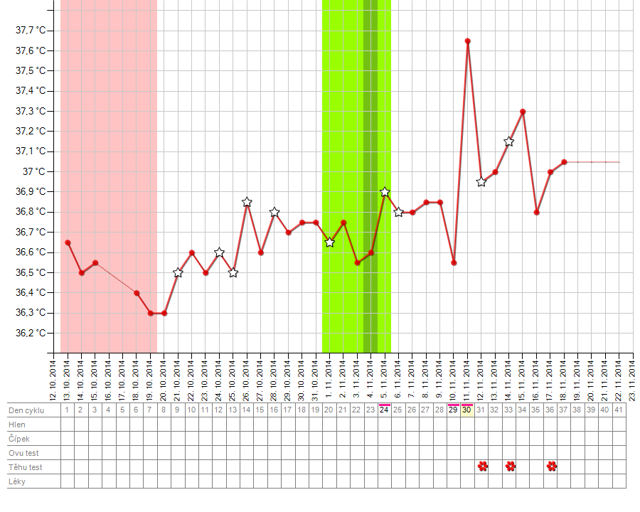 Ahojte, podívejte se, prosím, na můj graf. Myslíte, že ovulace byla opravdu 4.11. nebo to vypadá spíš na pozdější ovulaci (10.11.). 11.11. jsem měla jednodenní zvýšenou teplotu (37,4 tělesnou), tak i bazální je tím nejspíš ovlivněná.