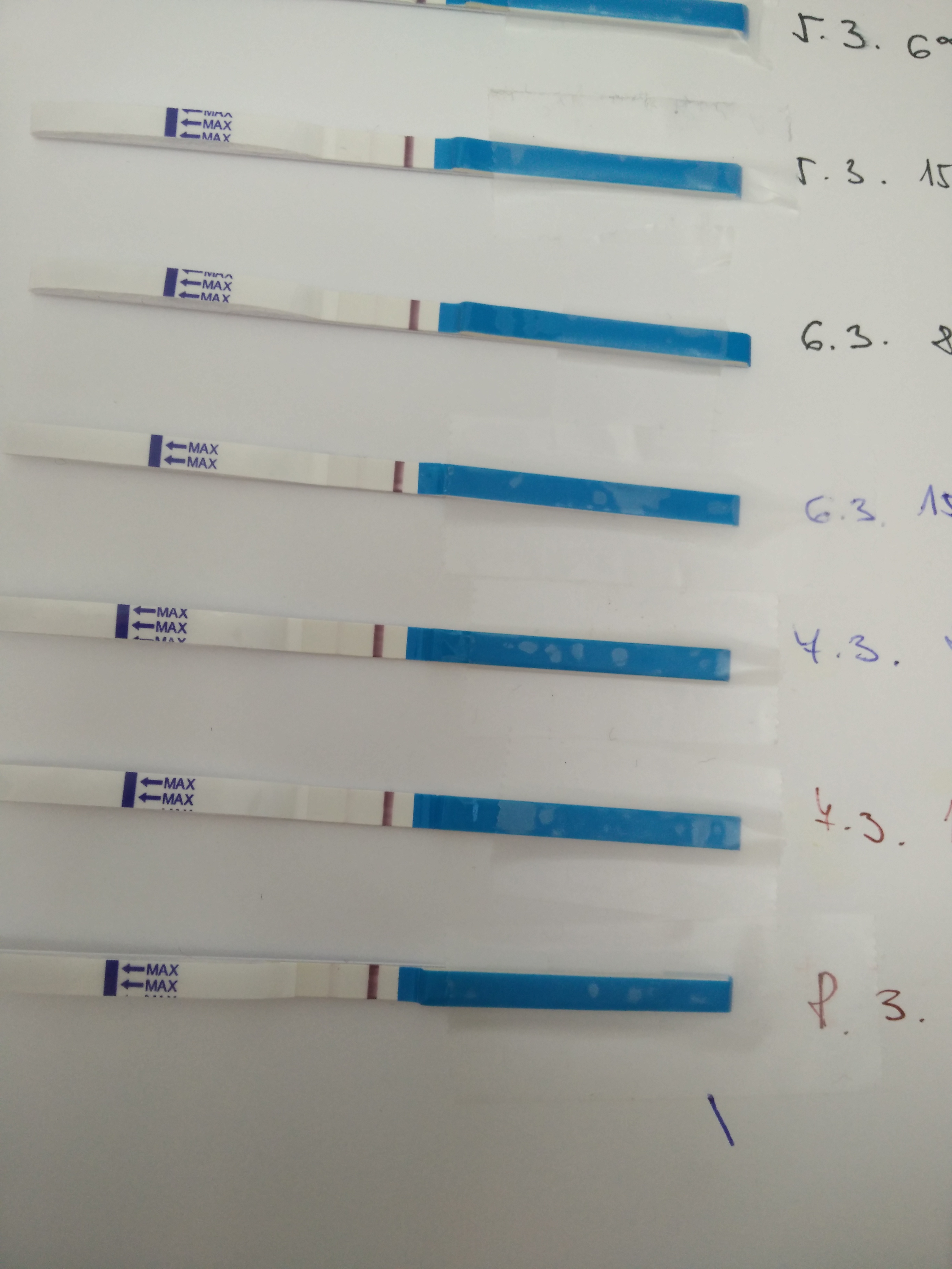 Ahoj holky, nedoplnuji minulou otazku,nevim proc,nejak mi to nejde. Takhle se vyvyji moje testy. Testuju 2x denne,jelikoz odpo jsou vzdy testy silnejsi. Jsem 10 den po transferu 2 petidennich blastocyst,hatchovanych a embryoglue. Biologicky se to da srovna k 15 DPO. tak a ted popravde,nemate pocit,ze jsou ty testy furt nejaky slaby? Nemely by bejt uz silnejsi? Vzdy horni test u data je ranni a spodni odpoledni. Posledni test je dnesni ranni.