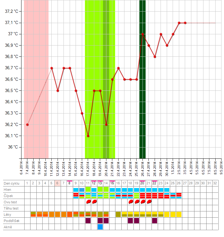 Ahoj holky, tak po pár dnech znovu přidávám křivku, původně jsem si myslela, že ovu proběhla tam, kde je vyznačena, ale teď i když hlen tomu vůbec neodpovídal a i ovu testy byly neg. bych se přikláněla až k tomu 25.4. Co myslíte vy zkušenější?
