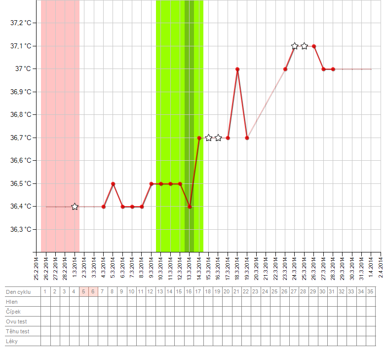 Ahoj, chtela bych se zeptat ohledne lutealni faze(pocet dni po ovu, kdy pak ma dorazit ms). Je VZDY stejne dlouha? Vsechny az na jednu vyjimku mam13dni dlouhe. U te vyjimky bylo zapsano 15 dni, ale to jsem asi celkove ten cyklus merila nepravidelne, tak to bylo mozna chybne. Dnes jsem 15DPO a ms stale nikde, ani bricho me neboli, jako kdyz to mam dostat. Zitra rano budu delat test. Jen jestli s tim ma nekdo zkusenost. pro info vlozim graf( prvni je ten ,,chybny,, a druhy nynejsi)