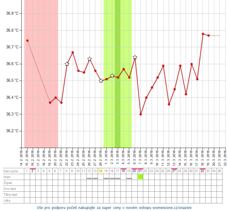 Mohly byste mrknout na můj graf? Mám meškání s menstruací přes týden a pořád nic, bolí mně chvilkama břicho už přes týden.. a teď mám dva dny nahoře teplotu.... těhotenský test je bílý..ale mám podezření jestli nemohla být toho 8.3. nikdy jsem neměla takové zpoždění a že už jsem celkem stará