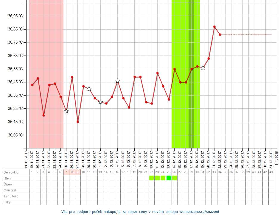 Ahoj, chtěla bych se zeptat, zda máte některá zkušenosti s opožděným vzestupem bt po ovulaci. Měřím teď třetí cyklus po porodu a i ten poslední cyklus, kdy jsem otěhotněla, vykazoval podobné znaky. Ukázkový plodný hlen cca 5 dní, 2. a 3. den hlenu silné bolesti kolem vaječníků, 4. den hlenu výrazný pokles teploty, poslední den hlenu vzestup nad linii. Ale v dalších 3 dnech hlen vymizí, teplota lehce poklesne na úroveň linie nebo malinko nad ní (ale není zde požadovaný rozdíl k určení ovulace), vymizí bolesti vaječníků a spíš mě začne bolet podbříšek. A teprve po těchto třech dnech teplota vzroste a jakoby ukáže ovulaci. Je možné, aby teplota po ovulaci nestoupla ihned a byl tu takový časový odstup? Děkuji za zkušenosti