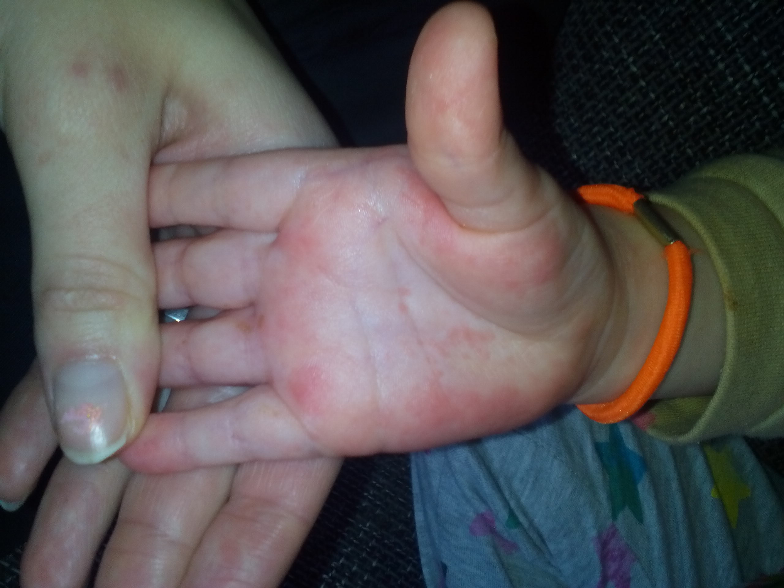 Holky SOS co to je ( viz. Foto) malá 2 r. Z niceho nic, rano nic neměla má osypané dlaně, v realu to vypadá hůře rudý vystouplý pupínek na pupínku, co jsem vygooglila tak nemoc ruce,nohy usta ale kolem pusinky nic, chodidla taky nic, sem tam pupinky kolem kolen... Máte s tímto zkušenost? A je to nějak rizikove pro těhotné ženy? Děkuji