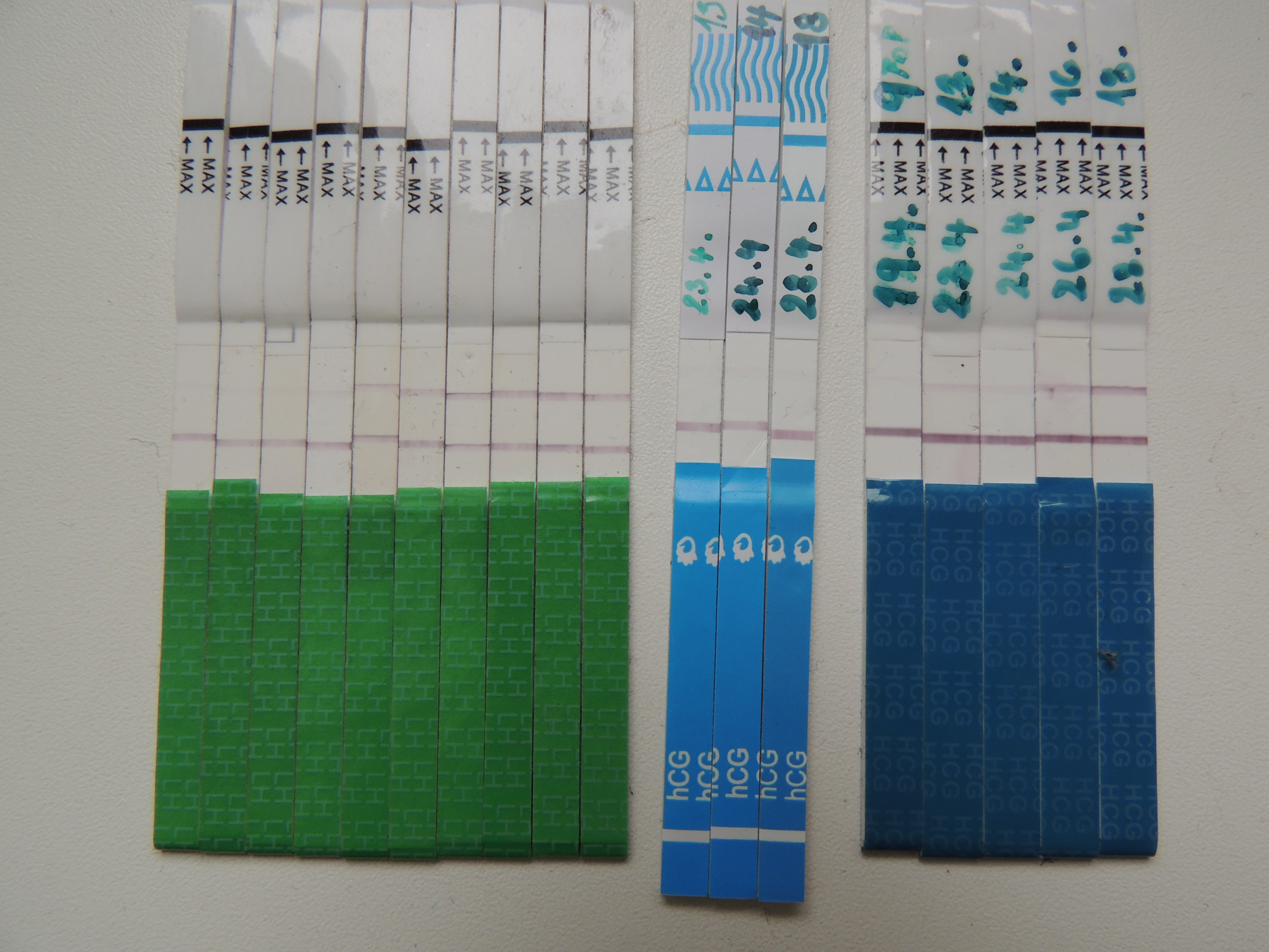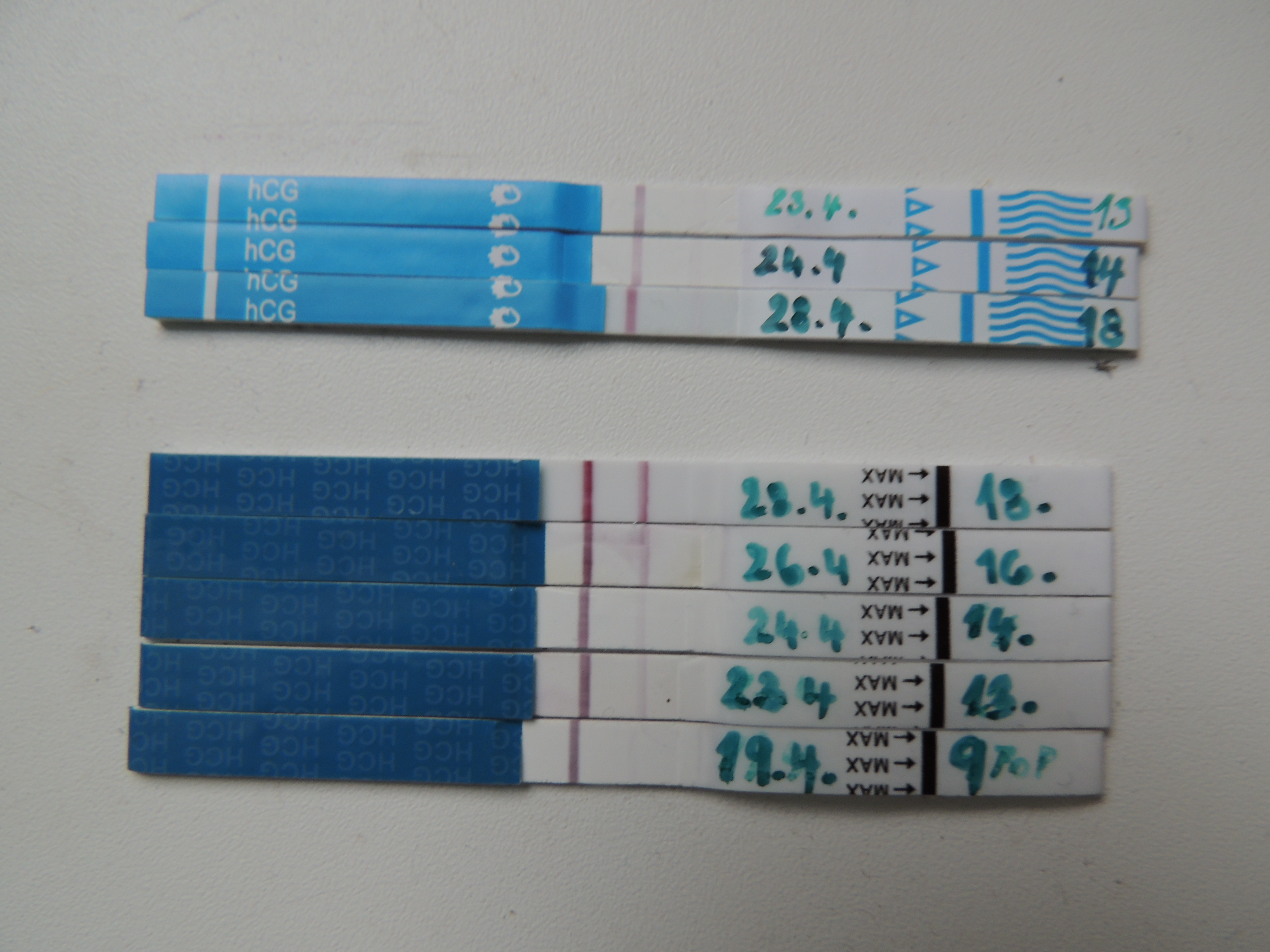 Ahoj holky, dnes jsem 28 den cyklu a 17-18. den po ovulaci . Koukněte na foto. Dva druhy testů, stejná citlivost. Na jednom čárky zřetelné- sílící (ještě není regulerní //) Na druhém sotva znatelní dušíci. Můžu doufat ?