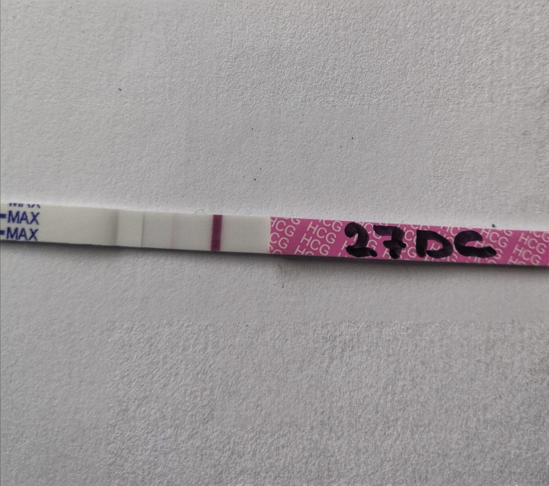 Dělala jsem si test, 27DC, není z ranní moči. Mně se jeví jako pozitivní, jen čárka není silná jako ta druhá. Co myslíte?