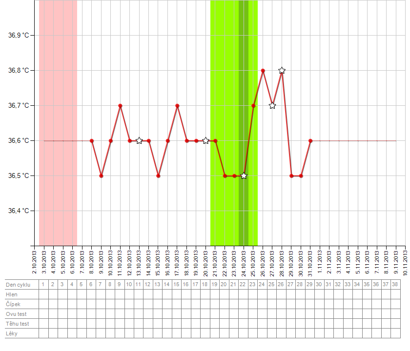 Maminky mám dotaz.přikládám graf proběhla ovulace podle grafu?vůbec se v tom nevyznám,pořád v tom tápu.brala jsem clostilbegyt.neměla jsem ovulaci a asi pořád nemám podle grafu??