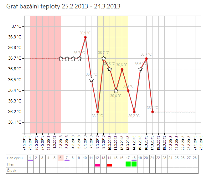 • Podle teplot ovulace neproběhla. Před ovulací jsou totiž teploty nízké, po ovulaci vyšší. Ovulace je pak poslední den nízkých teplot a pokud jsou tři dny teploty vyšší než šest předchozích. Tady ti to skáče nahoru a dolů - podobně vypadal můj před měsícem. Dělám si ovulační testy a ani jeden nebyl pozitivní, takže to byl anovulační cyklus....