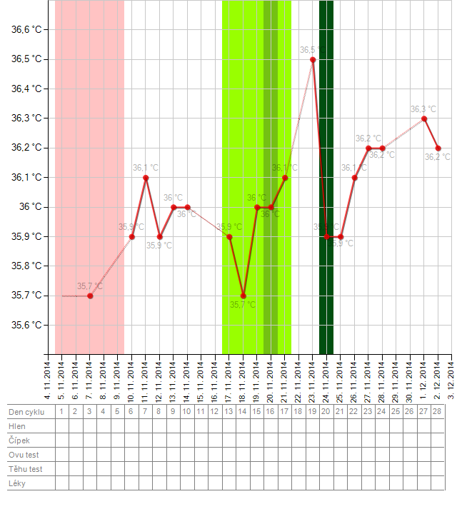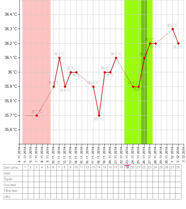 2.12.2014 9:02pokud by byla ovu ten 14DC tak tedka už je to bud a nebo. dokud nedorazí ms dá se usuzovat na cokoliv i na těhotenství. stavy před ms a v časném těhotenství jsou velmi podobné a ani graf nemusí být nijak výrazně odlišný, jens tím rozdílem, že ms nedorazí a teplota zůstává (někomu teplota klesá ažv průběhu ms nebo dokonce po ms případně až poklesne před novou ovulací).