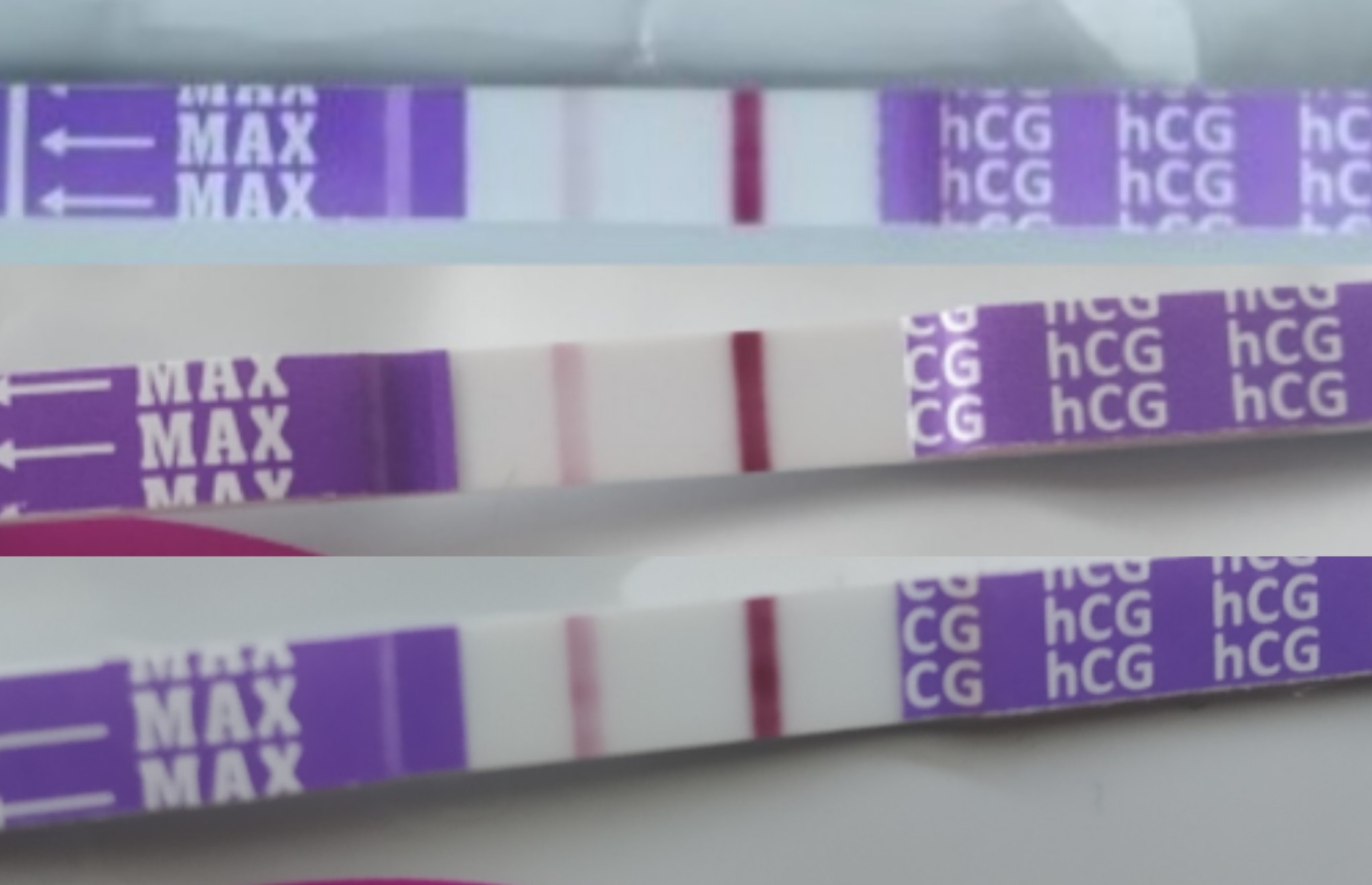 ve středu to byly tři týdny od potvrzené ovulace (prostřední test a spodní je dnešní)... Čekala bych už že budou čárky stejné
