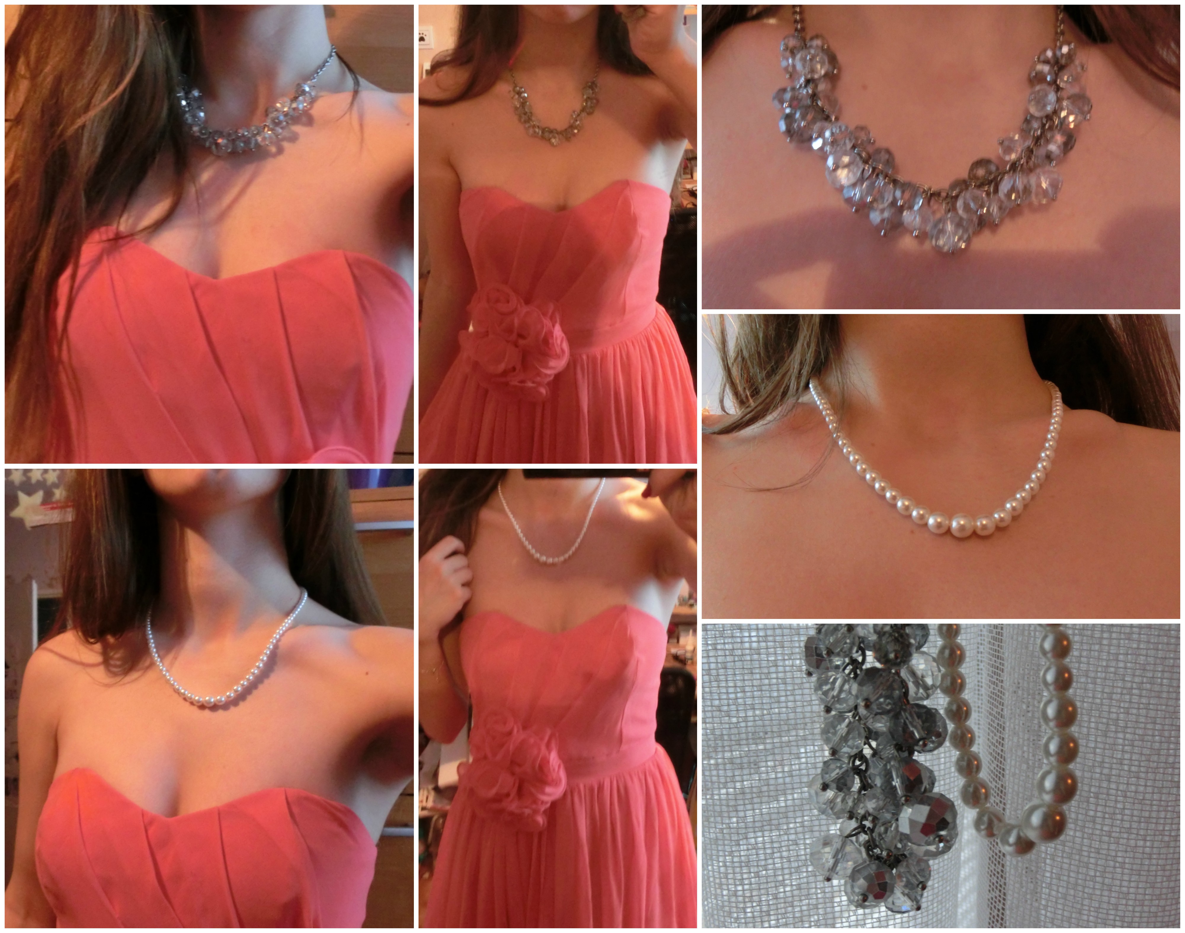 Ahoj, potřebovala bych rady o tom, co si mám dát k šatům za náušnice, náhrdelník, prstýnek nebo jaký udělat účes. Přidala jsem fotky, jak vypadají moje šaty (jejich pravá barva je na třetí fotce, první fotka v koláži), náhrdelníky, které bych si vzala, náušnice, prstýnky a taky jestli rozpuštěné nebo stáhnuté vlasy. V případě náhrdelníku mě napadlo, že bych si koupila nový s nějakým "diamantem". Jinak šaty jsou krátké, barvou asi meruňkové a podpatky černé.