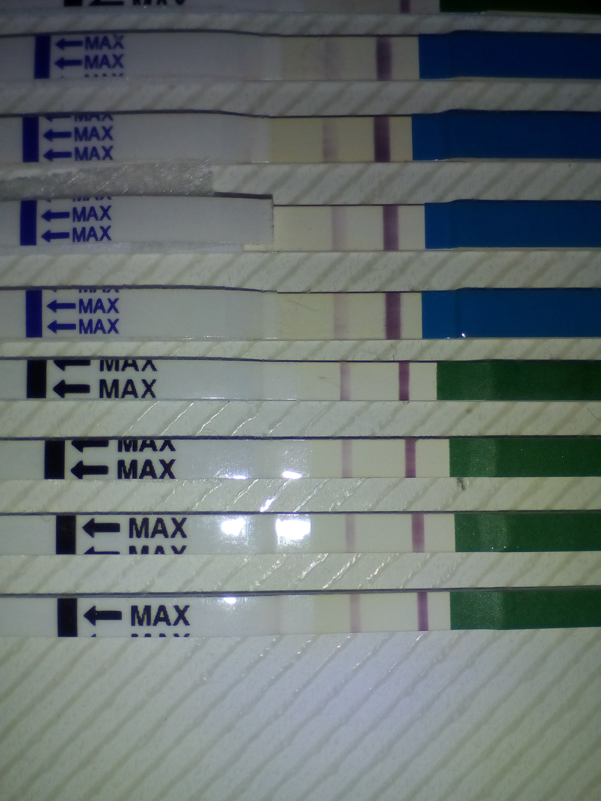 Tak jsem přestala testy tak často, ale chtěla jsem vidět rozdíl před a po víkendu. Výsledek je na foto, druhá čarka je stále stejná, ten úplně dole je z dnešního rána, ten nadtím z pátku a další. Značí to tedy nějaký problém, že? 17.2. jsem byla na krvi, hcg bylo 210 kednotek. Prosím poraďte, zda máte někdo podobnou zkušenost. Děkuji.