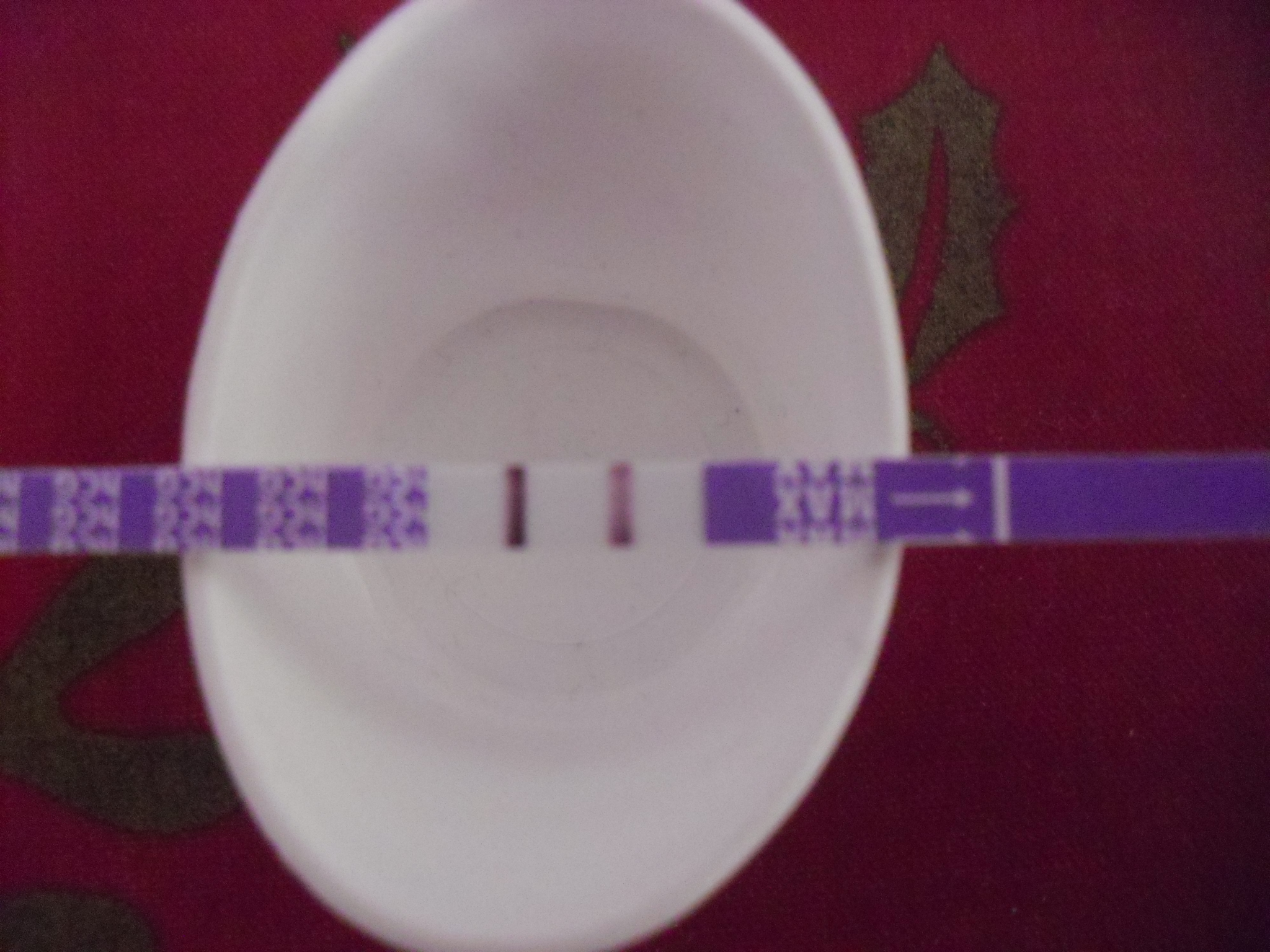 tady je můj test 19 dní po ovulaci a pořád není úplně stejně zbarvený