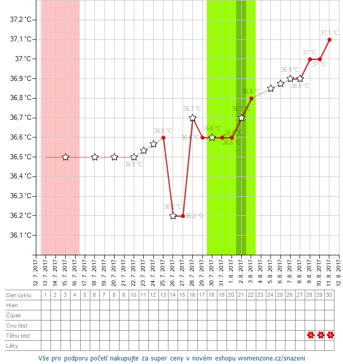 Ahoj holky, jelikož jsem spíše samotář, nemám ani současný problém s kým řešit :/, proto se obracím na Vás, v červnu zamlklý potrat v 10 tt s revizí dělohy, následně přišla porevizní MS 27 DC, dnes jsem 30 DC a bazální teplota stoupá (přikládám graf), prsa mám nateklá, ale jinak žádné změny, TT negativní. Myslíte, že by to mohlo být i přesto těhotenství jen je na test brzy? nebo je vše jen nějak vsugerované? předem děkuji ;)
