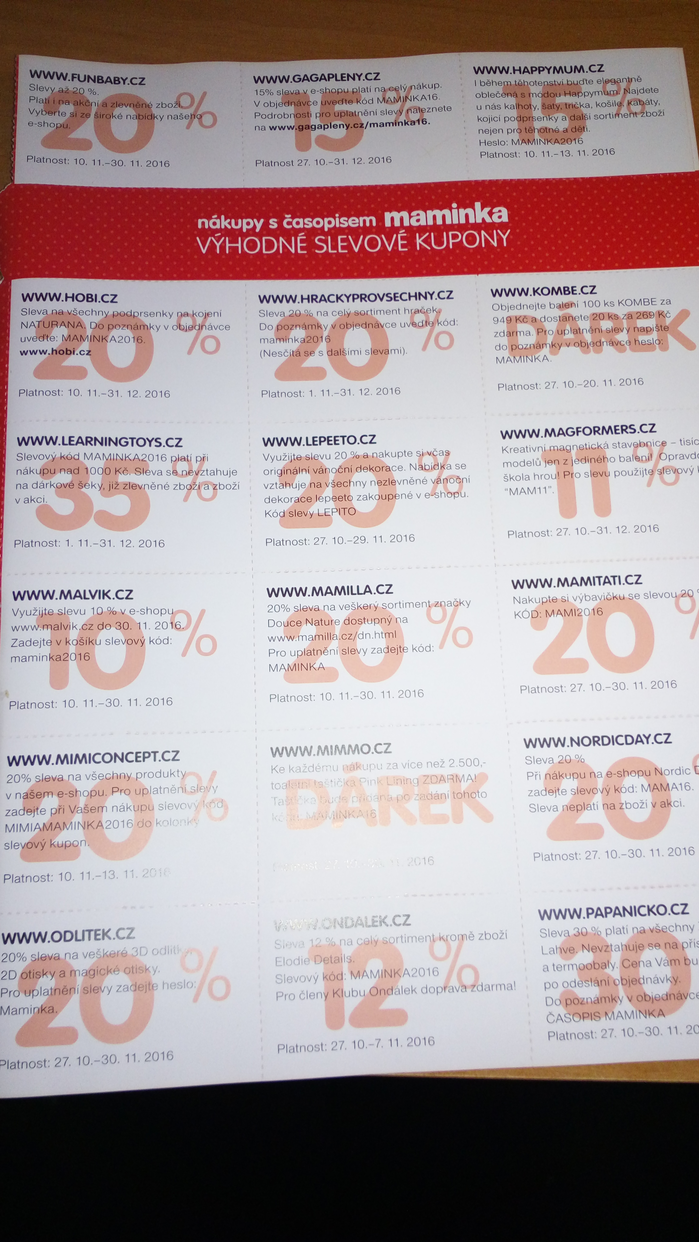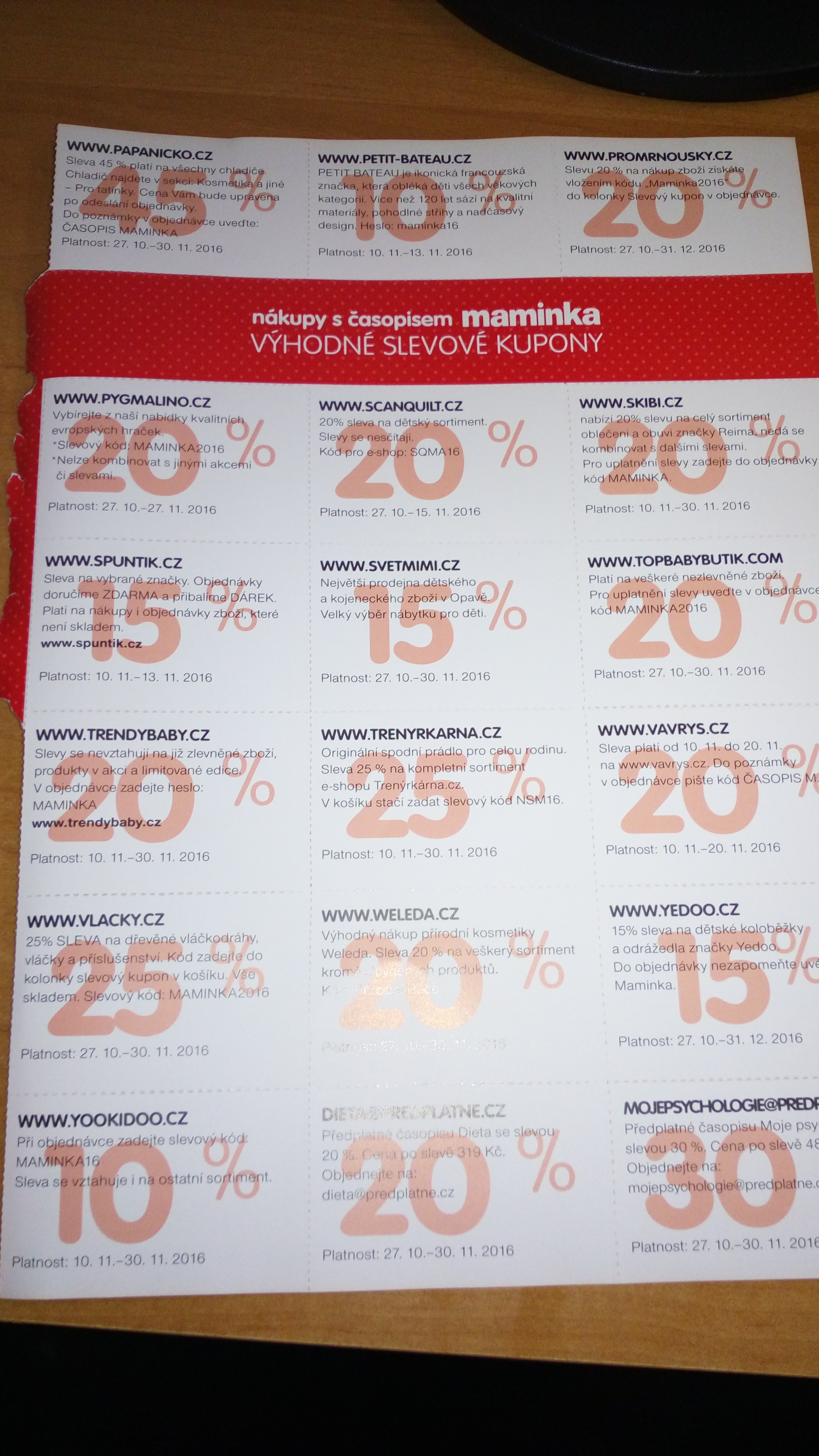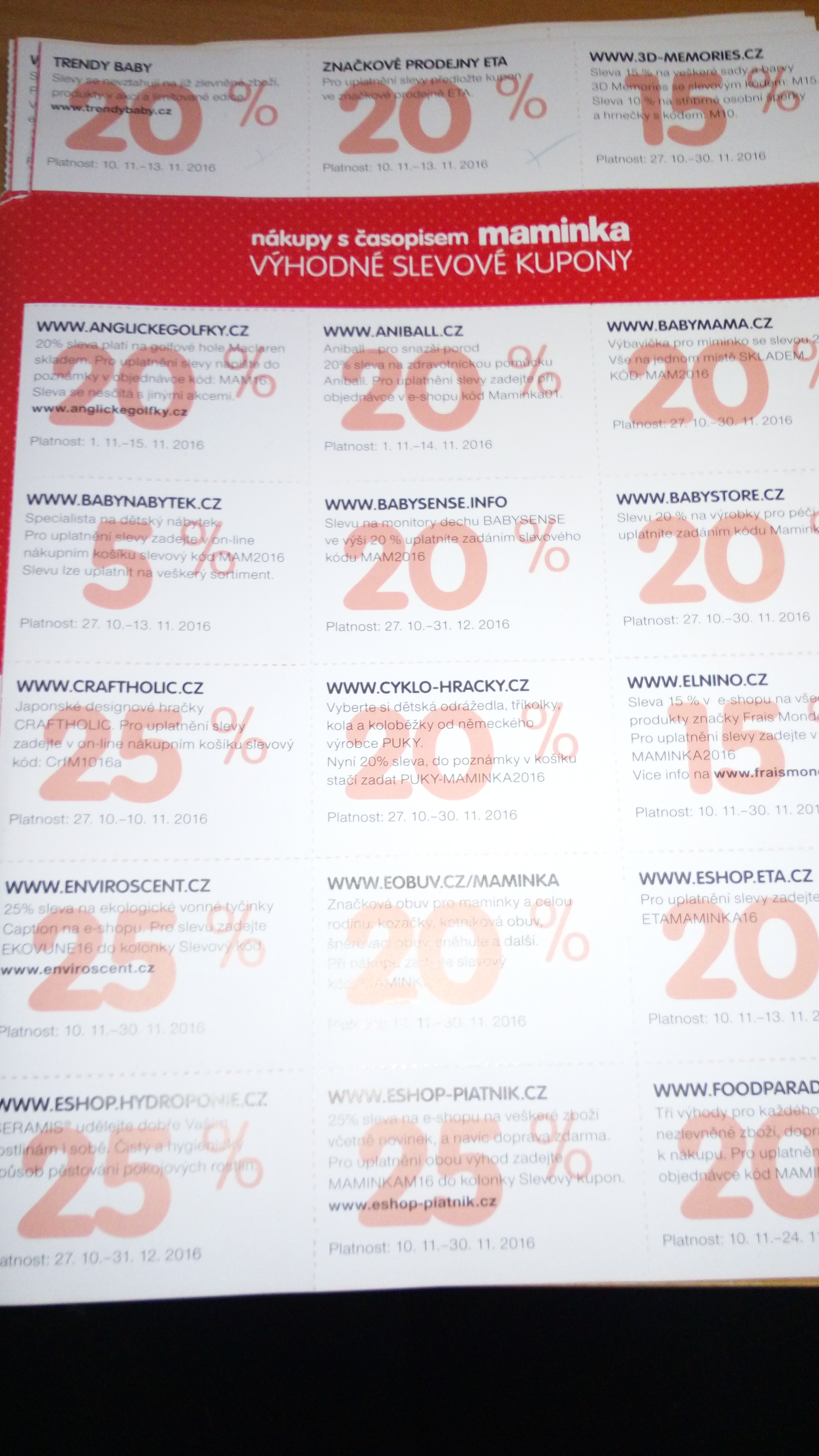 Holky neměla by jste někdo zájem o slevové kupony z časopisu Maminka?Já jich moc nevyužiji a zbytek se mi nechce jen tak vyhodit, třeba pro někoho tam budou dobré slevy např.Aniball,Eta,Babysense atd.Kdyby měl někdo zájem tak to sem vypíši.:-)
