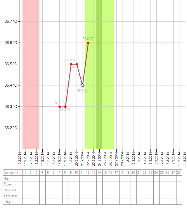 můj poslední cyklus byl 11.-14.2. po 29.dnech...podle kalendářové metody bych měla mít od 22.-26.2. plodné dny a stoho 24.2. by měl býti ovulační....BT jsem začala měřit cca 3.den po skončení cyklu kdy jsem ještě slabě špinila...zřejmě podle teploty mám konec pl. dnů a poznala jsem to i podle čirého výtoku....v pátek 21.2. při naměřené BT, která byla 36,4 byl sex......je malinká naděje, že by se vajíčko mohlo uchytit pokud to země všechno třeba při čůrání nevyteklo